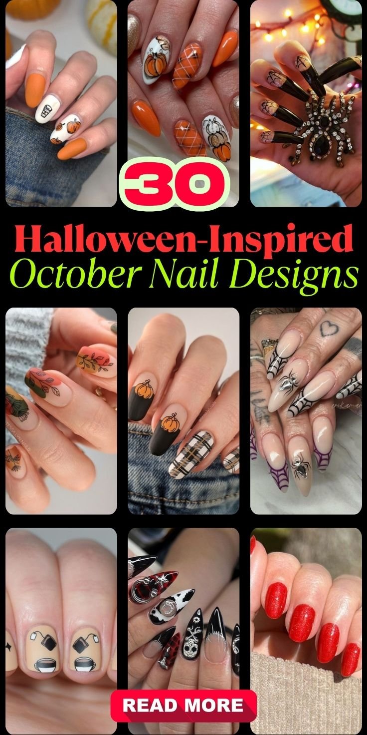 Think burnt oranges, deep burgundies, forest greens, and matte blacks with glittery overlays. For a subtler look, try a nude base with dainty leaf or web details. Want to go bold? Opt for coffin-shaped nails painted with haunted house scenes or blood-drip effects. For something more chic, consider velvet finishes, metallic accents, or a classic French tip with an autumnal twist. No matter your preference, there's a look to match your personality and the mood of October.